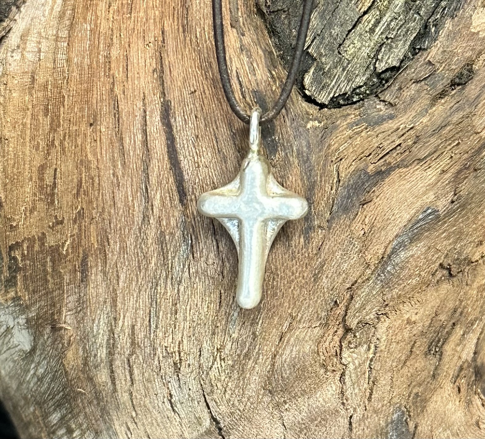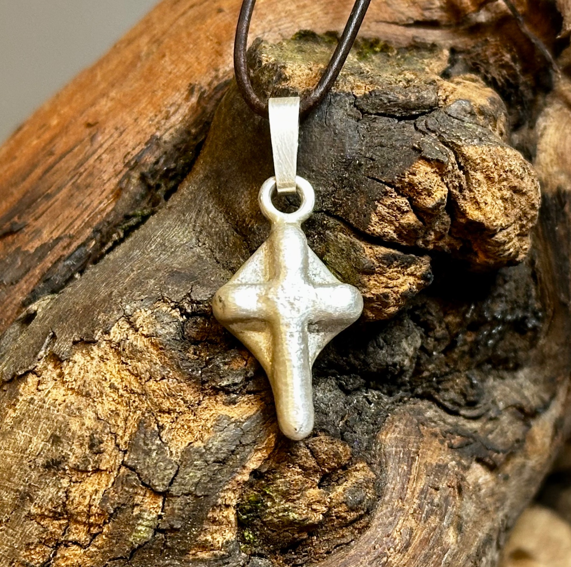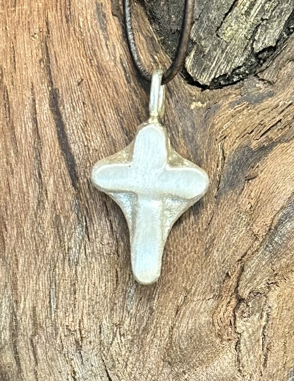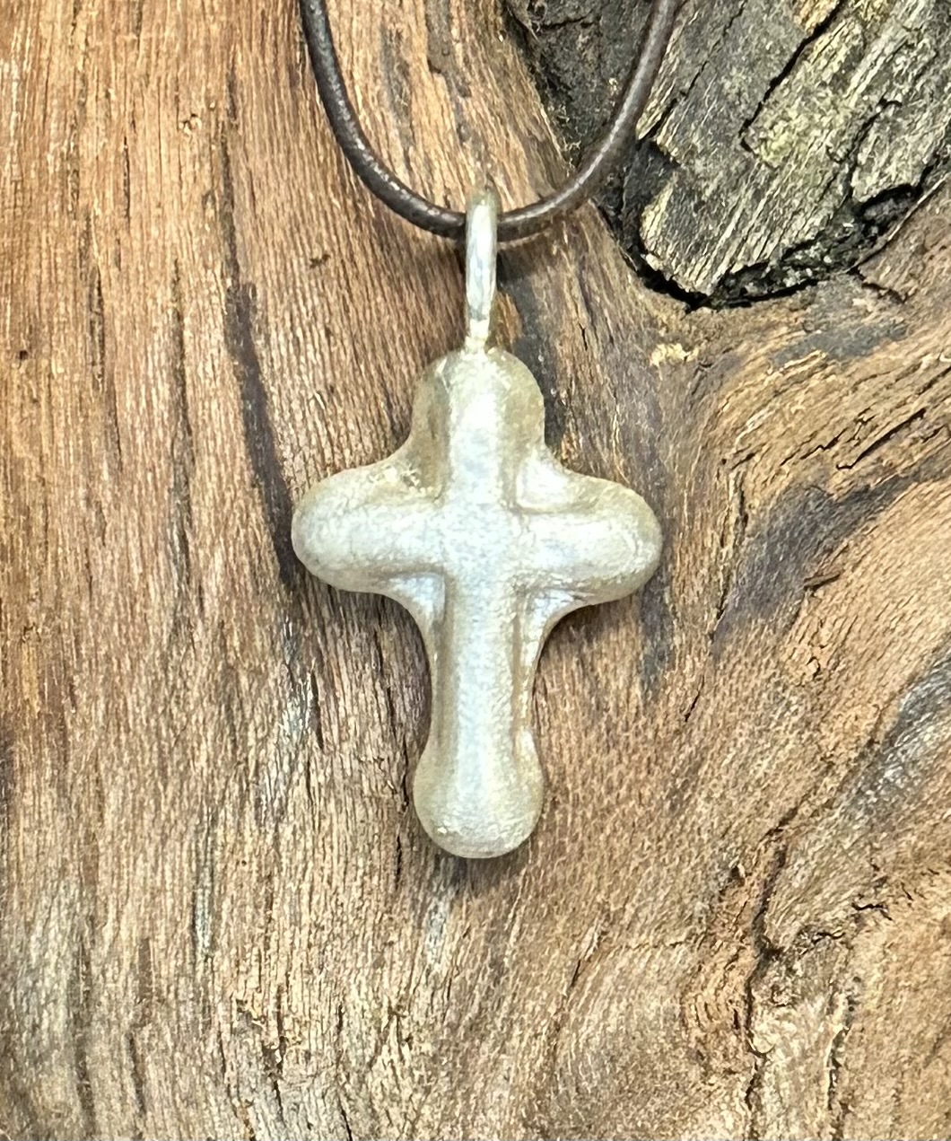 Silberkreuz aus 925er Silber ca. 7 gr. Oberfläche gebürstet, Maße: h 32 mit Öse, b 14, Öse 2,5 Knorzekreuz 1429