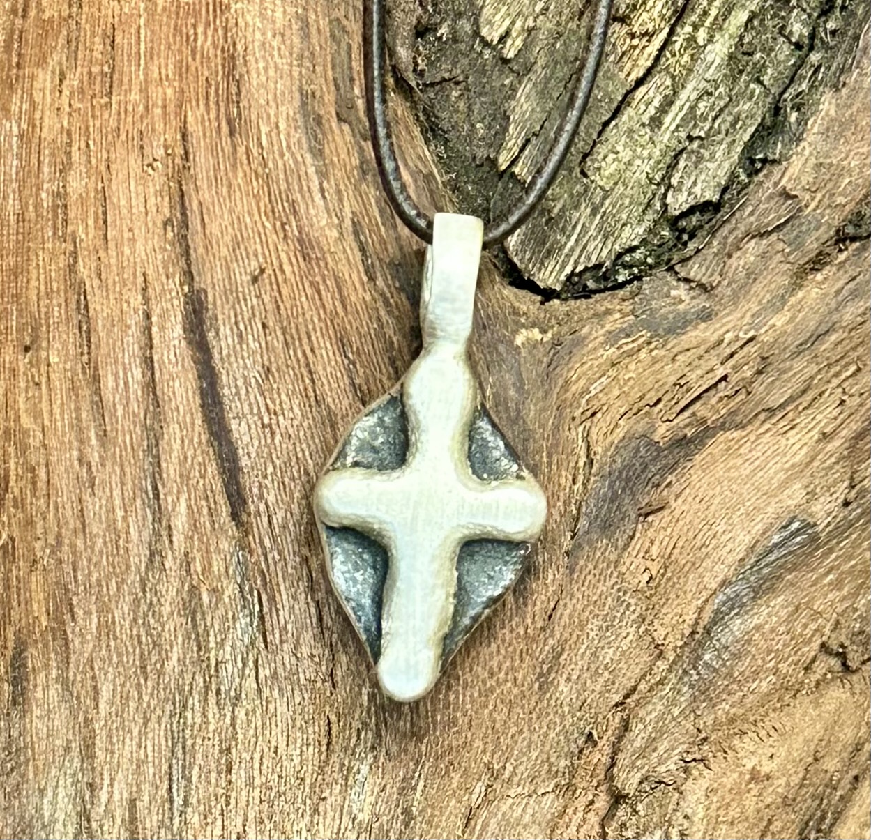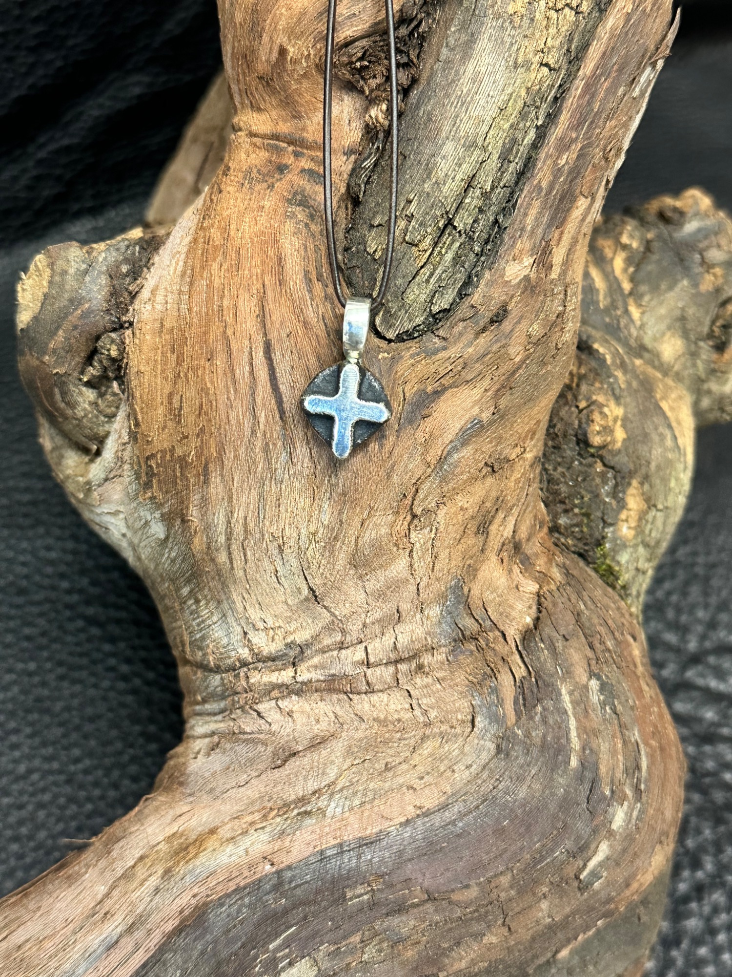 Silberkreuz 925er ca. 9,1 gr. Fläche poliert, mit Silberoxid geschwärzt. Maße: h 27,1 mit Öse, b 15,7, Öse 7 mm innen Knorzekreuz 1428